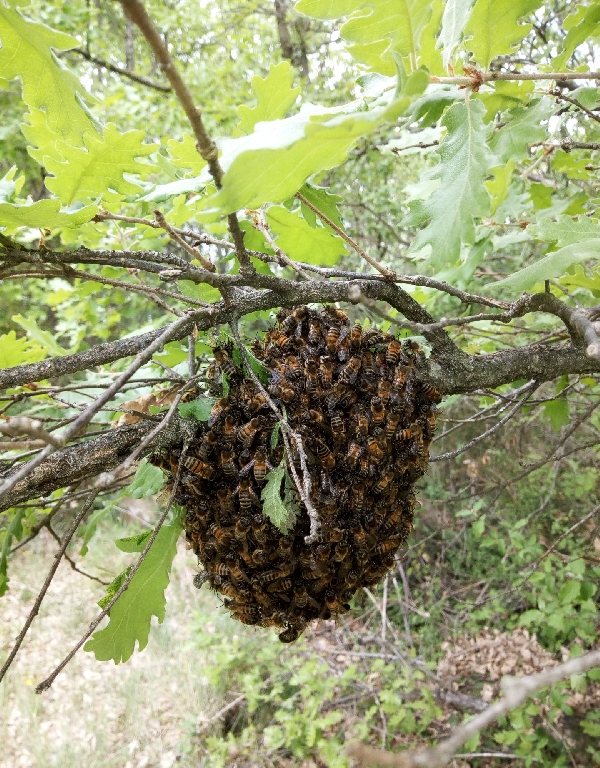 Avril, mai, juin sont des mois pendant lesquels les abeilles essaiment... c'est à dire que la colonie est devenue trop importante dans la ruche par rapport à la capacité de la ruche et aux réserves de celle ci.
